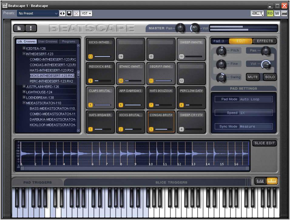 В достаточно интересном фразовом модуле Beatscape вы можете оперировать 16-ю падами, генераторами и 48-ю эффектами для создания грувов, битов и т.п. Это очень практичный, внешне не сильно нагруженный инструмент для получения интересных ритмических и мелодических loop'ов, и, если рассматривать конкурирующие в этом сегменте программы, то всё выполнено на высоком уровне. То есть, для производства тех же ремиксов, современной танцевальной и электронной музыки данная вещь может оказаться незаменимой. Специально для этого модуля поставляется банк объёмом в 4 Гб.