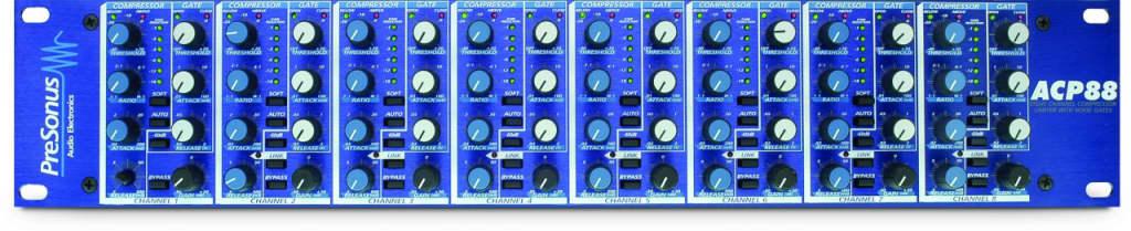 PreSonus ACP-88 (ACP 88) - восьмиканальный компрессор/лимитер с гейтом, занимающий в стойке две рэковых единицы. Каждый канал имеет индивидуальные регуляторы параметров компрессора и гейта. У компрессора пороговый уровень изменяется в пределах от -40 до +20 дБ, а степень сжатия от 1:1 до оо:1. При нажатии на кнопку Auto время атаки и восстановления может устанавливаться автоматически. Для ручной установки этих параметров существуют ручки Attack и Release с диапазонами регулировки от 0,02 до 200 мс и от 0,5 до 500 мс соответственно. Кнопка Soft переключает мягкий и жесткий типы компрессии. Степень подавления сигнала каждым каналом отображается светодиодным индикатором.
