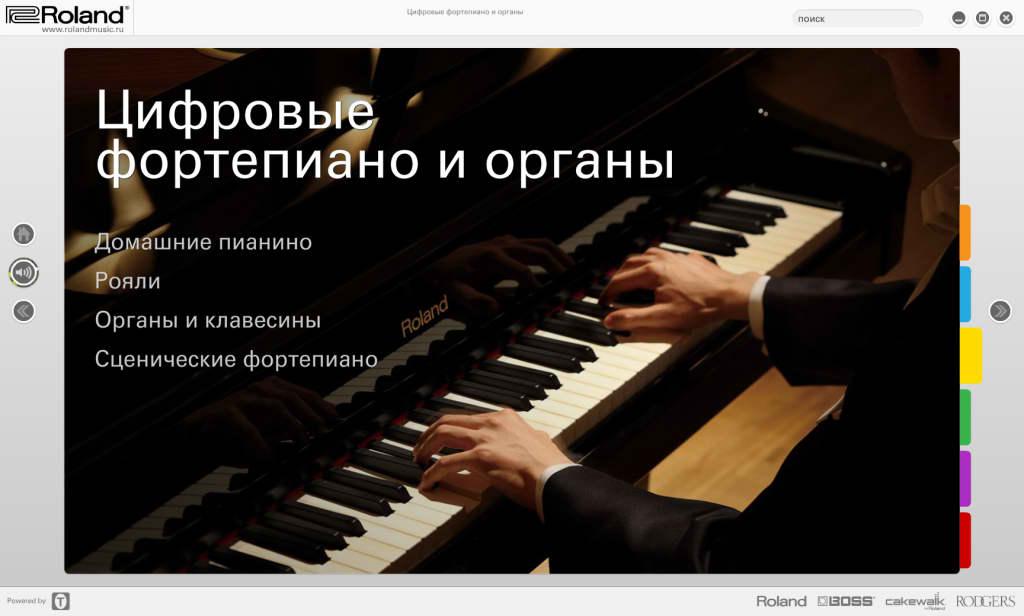 В каталоге представлены продукты Roland с описаниями и демо материалами в аудио и видео форматах.