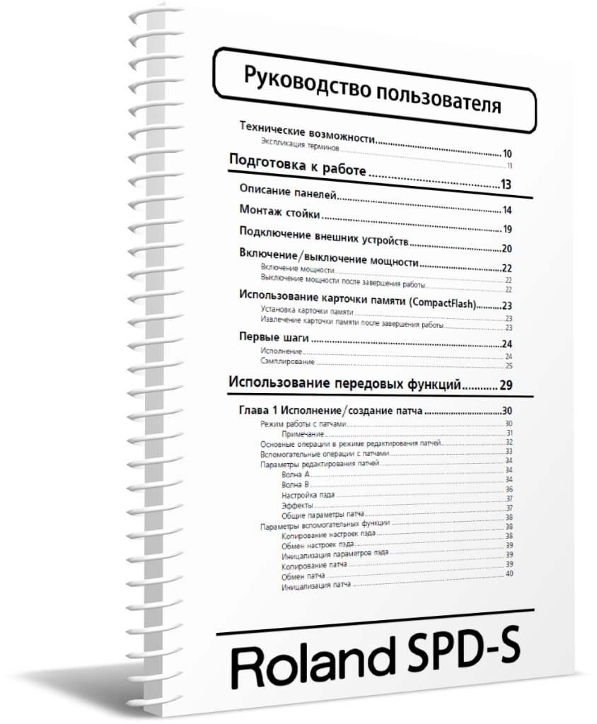 Руководство пользователя на русском языке для продукта Roland SPD-S, формат A4, переплёт пластиковая пружина, обложки пластиковые, 134 страницы.